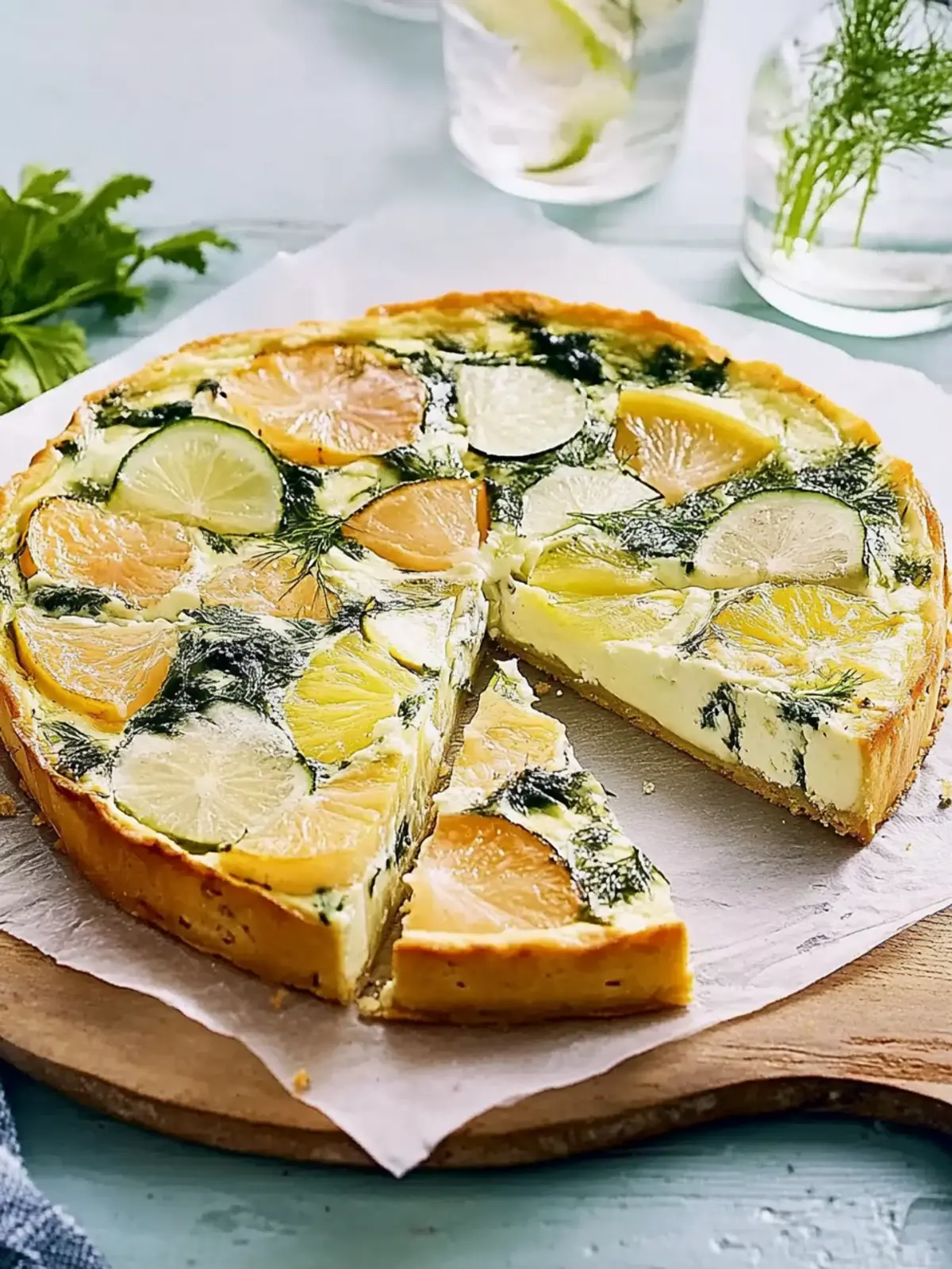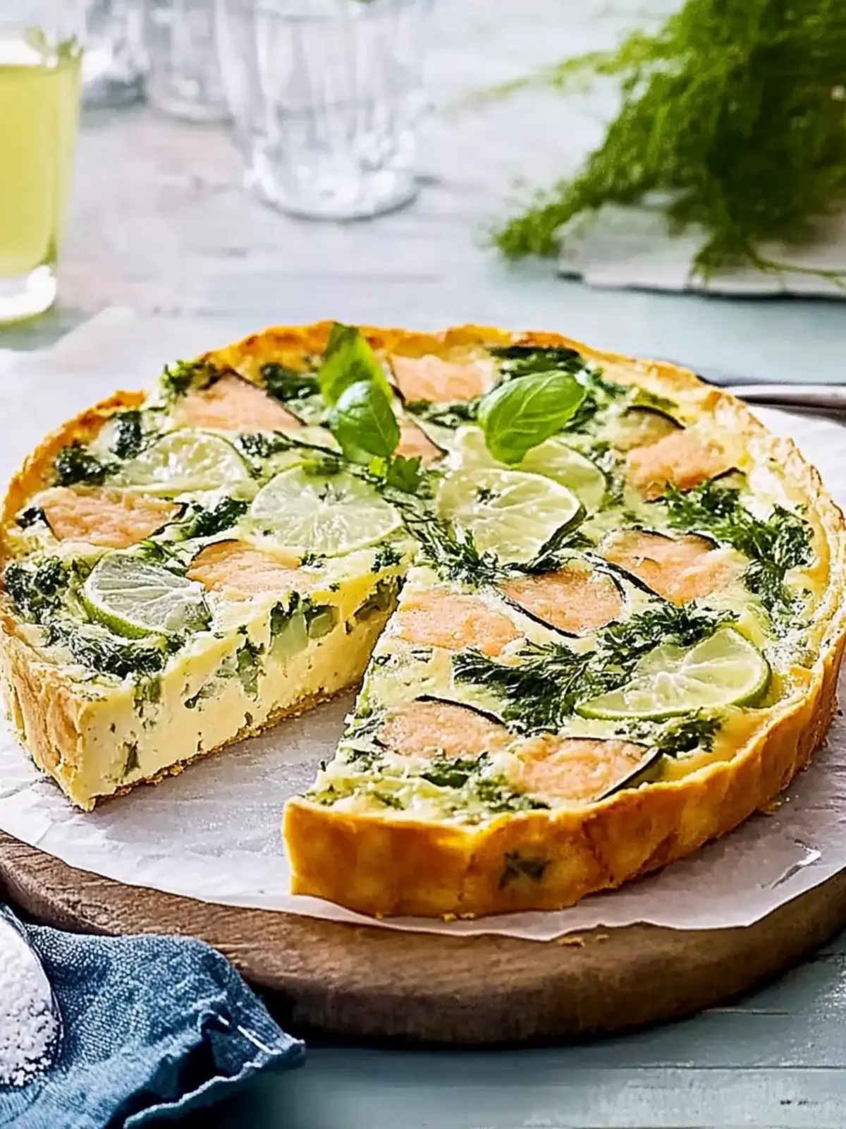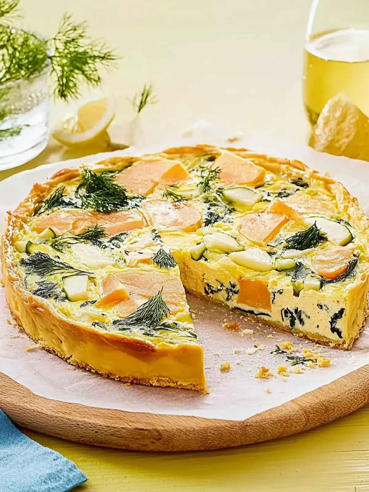 Nimm die Quiche aus dem Ofen und lasse sie 10 Minuten ruhen, bevor du sie in Stücke schneidest. Dies hilft, die Form zu stabilisieren, und sorgt dafür, dass sich die Aromen setzen. Garniere die Quiche mit dem restlichen Dill für einen ansprechenden Look.
