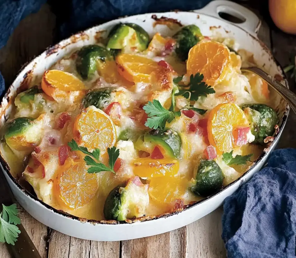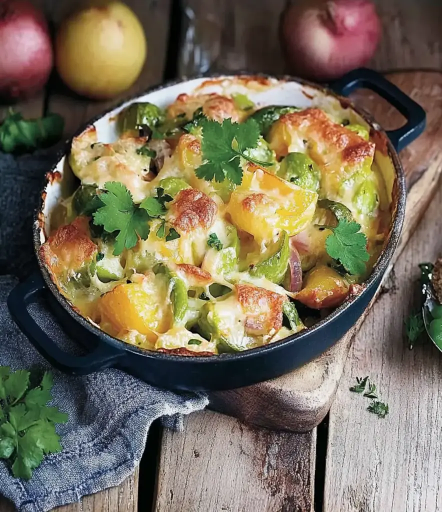 Köstlicher Rosenkohl-Kartoffel-Auflauf, der erdige Aromen vereint und in nur 45 Minuten zubereitet werden kann.